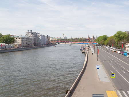 Moscow - May 9, 2015: View towards the Kremlin on the Moskva embankment with Big Ustinevskogo bridge and people walking in the Victory Day May 9, 2015, Moscow, Russia