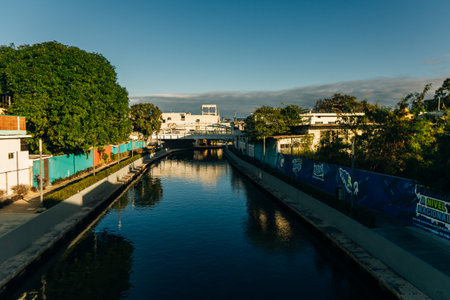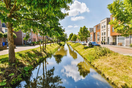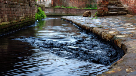 Serene waterway flows through historic brick lined canal, showcasing dark, rippling water. cobblestone path alongside adds charm to tranquil scene, surrounded by lush greenery