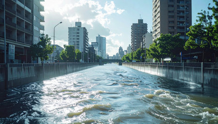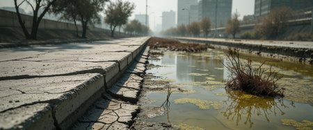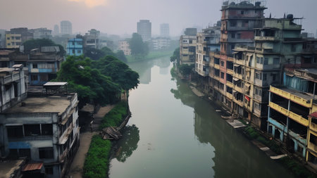 A polluted river flowing through a cityscape, shedding light on the consequences of water pollution in urban areas. Generative Ai