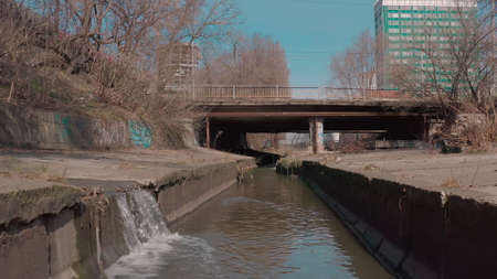 nature is surrounded in the city, the river is walled up in a concrete channel. a daytime river into which chemical waste is dumped. water concrete reservoir in the city. Cityscape 4k Aerial Flight