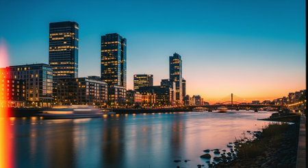 amazing a city skyline with a a cityscape featuring a towering skyscraper a bustling street and a serene river flowing through it png