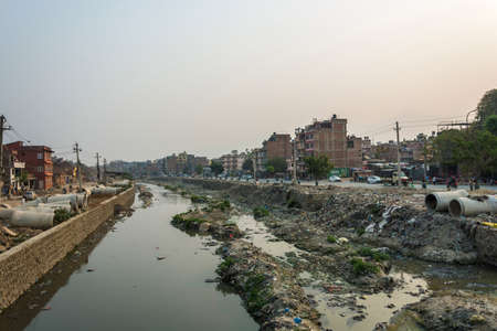Kathmandu, Nepal - March 25, 2018: Polluted river in the center of the city on March 25, 2018 in Kathmandu, Nepal.