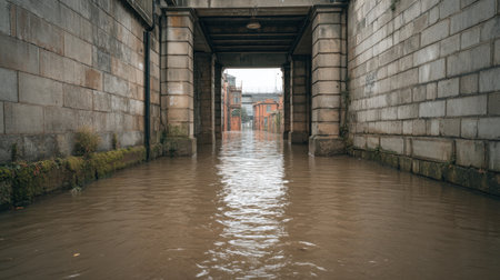 A tranquil view of a flooded urban passageway, showcasing stone archways and calm water, creating a serene yet melancholic atmosphere under overcast skies.