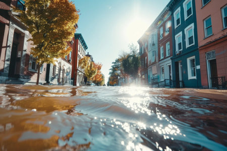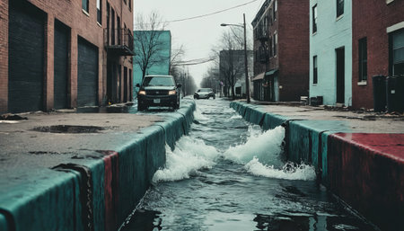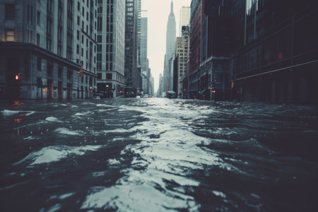Dramatic urban wave flooding desolate city street with intense energy.