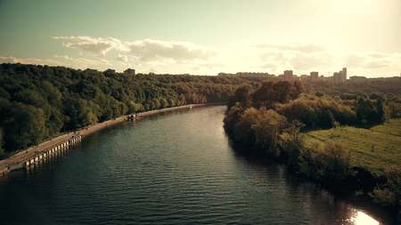Aerial shot of the Moscow river and Fili park riverside on a sunny day