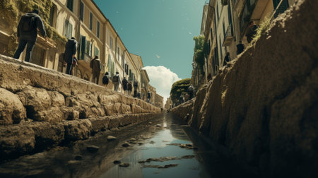 Roman road in a reality with reversed gravity pedestrians walking upside down