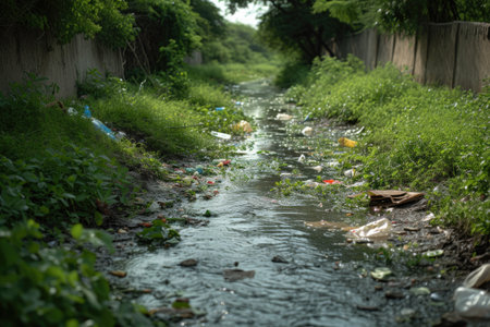 A stream with a lot of trash and trees. Generative AI.