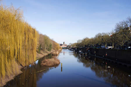 Canal in the center of Den Bosch with trees on the side in the Netherlands with a clear blue sky