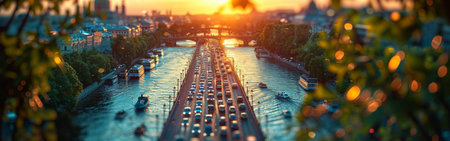 An aerial view of a city street with heavy traffic, framed by trees and foliage. The street runs along the edge of a river, with boats visible in the water. The sun is setting in the distance, casting a warm glow over the scene.