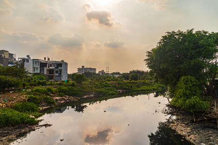 Puducherry, INDIA - January 27: Canal with sewage is splitting French part of the city from Indian part in Puducherry, also known as Pondicherry, on January 27, 2013.