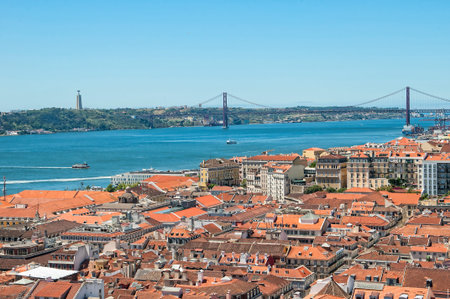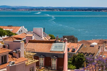 Aerial view of red roofs of Alfama and the River Tagus, Lisbon, Portugal. Lisbon is colorful, friendly and very attractive.