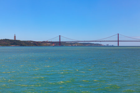 A view from the water of a huge suspension bridge Ponte 25 de Abril over the river Tagus in Lisbon, Portugal on a warm morning day with the horizon in the background