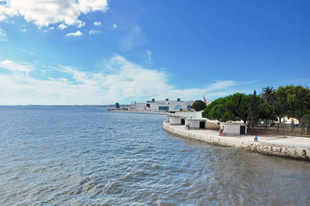 Walkway with view on Vasco da Gama bridge on the Tejo river. Lisbon, Portugal.