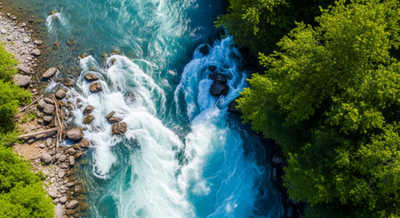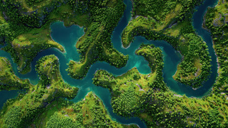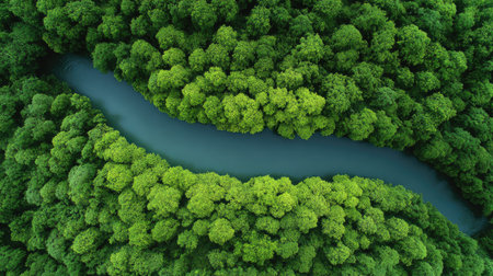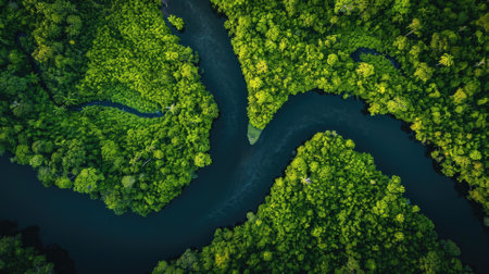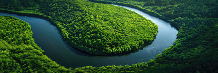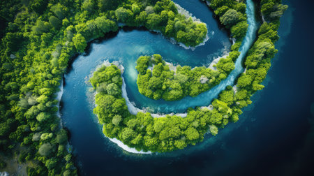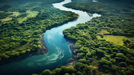An aerial view showcases a breathtaking landscape featuring a winding river enveloped by vibrant, lush greenery. Generative AI