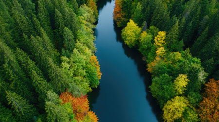 An aerial perspective reveals a dark, winding river snaking through a dense forest. The trees are ablaze with vibrant autumn foliage in shades of green, yellow, orange, and brown, creating a striking contrast with the deep blue water. The river's numerous curves and bends form natural patterns within the lush forest canopy. showcases the serene beauty of nature and the rich colors of the fall season from an overhead viewpoint.