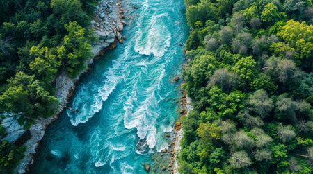 An aerial perspective capturing a river flowing through a lush forest, with dense trees lining the banks. The water glistens under the sunlight, while the greenery forms a natural border along the meandering river.