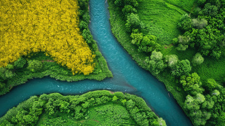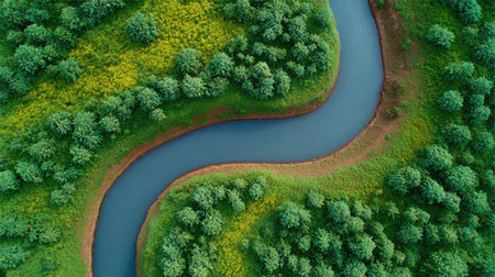 Stunning aerial view captures a winding river surrounded by lush greenery and vibrant wildflowers, showcasing the beauty and tranquility of the natural landscape.