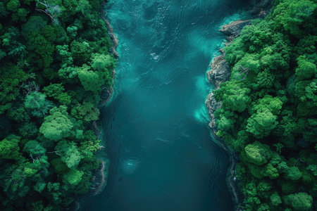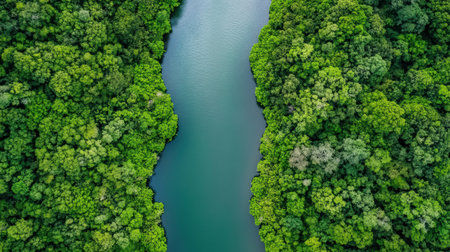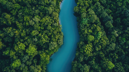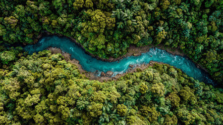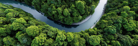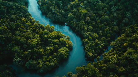 Lush green rainforest embracing a calm river from an aerial perspective, symbolizing tranquility and natures beauty.