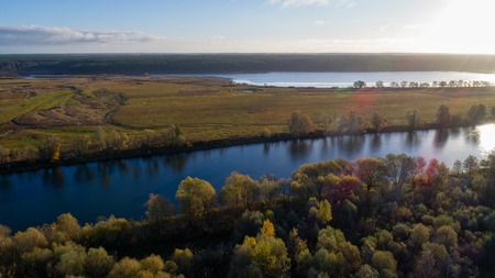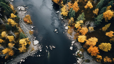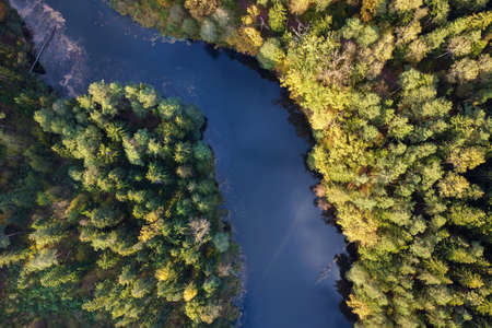 Aerial view of the river in autumn forest. Top view.