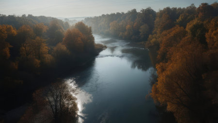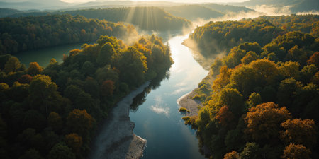 An aerial shot captures a river winding through a forest, with trees displaying autumn colors. The suns rays create a shimmering effect on the water.