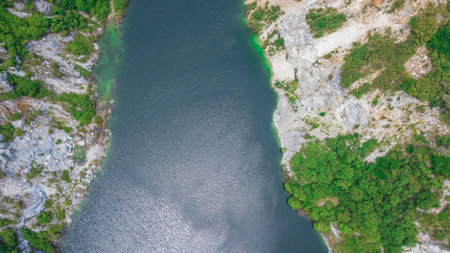 Top view of azure lake with green coast. Beautiful water body captured from drone. Aerial view of picturesque landscape with crystal clear pond. Summer vacation concept. Wild nature paradise