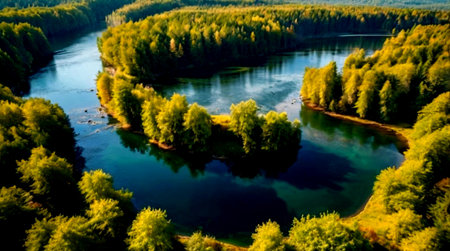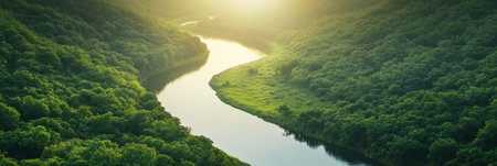 An aerial perspective captures a winding river snaking its way through a dense forest bathed in the warm, golden light of either sunrise or sunset. The sunlight filters through the lush green canopy, creating a dappled effect and illuminating the trees with a vibrant glow. The river's surface reflects the warm light and the surrounding foliage, adding to the serene and tranquil atmosphere of the scene. The vast expanse of the forest and the gentle curve of the river create a picturesque and...
