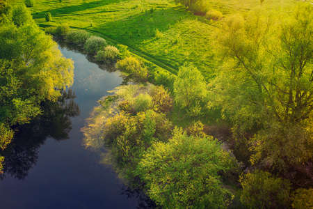 Green beautiful landscape with river, fields and forest, right angle aerial view