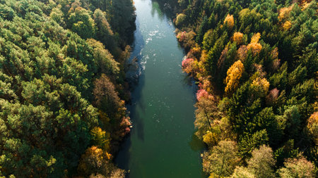 Autumn colorful forest and Broda river at sunrise in Poland, Europe. Aerial view of nature.