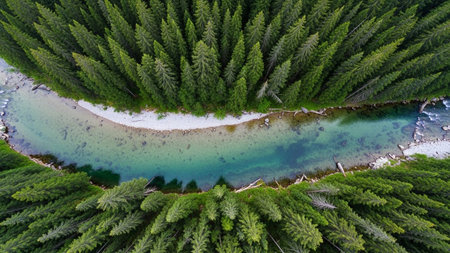 An aerial perspective reveals a winding river carving its path through a dense, vibrant green evergreen forest. The dark, rich canopy of coniferous trees stretches out on either side, creating a striking contrast with the dark, rippling water of the river. The scene conveys a sense of untouched wilderness and the serene beauty of a natural, undisturbed landscape, highlighting the intricate patterns formed by the trees and the flowing water.