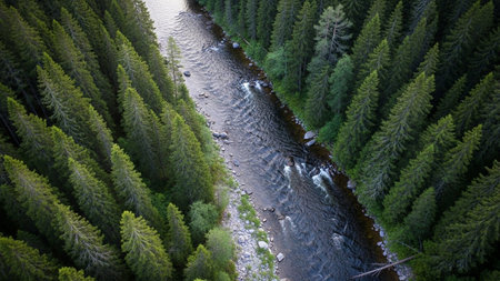 Aerial view of the river in the coniferous forest