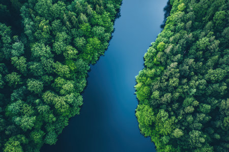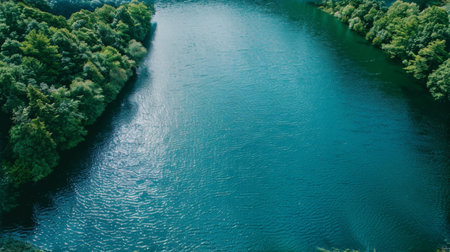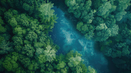 This aerial view captures a tranquil river embraced by vibrant green forests. The serene waters reflect the surrounding beauty, showcasing natures peace and harmony.