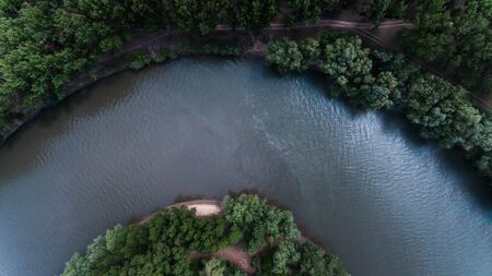 Aerial view of the forest and river. Drone photography. Top view