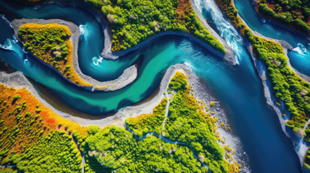 An aerial perspective showcases a vibrant, meandering river flowing through a dense forest. The image features a rich palette of greens and blues, with a dynamic composition emphasizing the curves of the river. This visually appealing landscape could be utilized for various commercial and editorial projects.