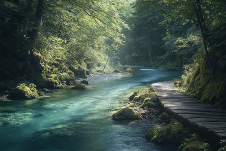 A wooden boardwalk over the blue-green river, surrounded by lush greenery and moss-covered rocks in an idyllic forest setting. The water flows gently, with sunlight filtering through the trees, creating soft shadows on its surface. A tranquil scene of nature's beauty. --ar 3:2 --v 6.1 Job ID: af3e7454-bc9d-4733-a203-df1f91d909b4