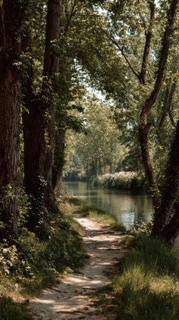 Idyllic woodland path by a serene river, bathed in soft, dappled sunlight.