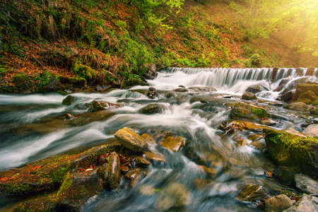Waterfall in the mountains at sunset. Colorful summer landscape.