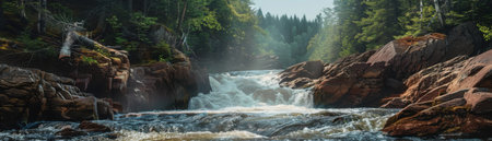 Experience the serene beauty of a mountain river flowing gently through a dense forest. Mist envelops the landscape, creating a tranquil atmosphere in nature.