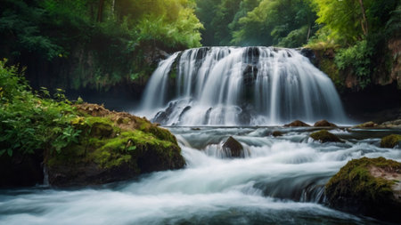 Misty waterfall flows through lush green forest. Serene and magical scene.
