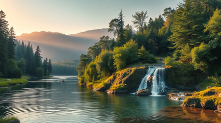 A peaceful waterfall flowing gently into a calm river, with soft moss-covered rocks lining the shore.
