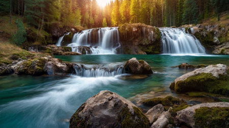 AI Generated. Water cascading down rocky cliffs creating a silky smooth waterfall