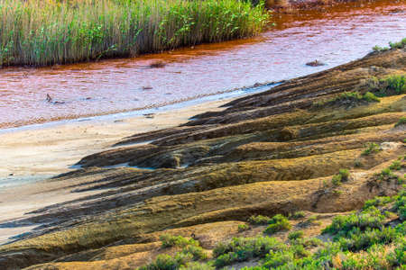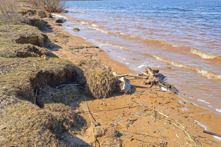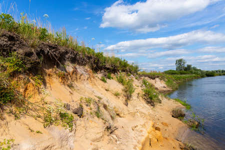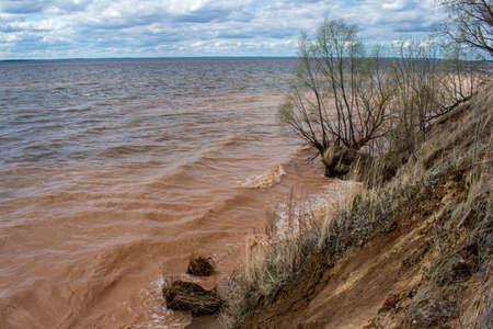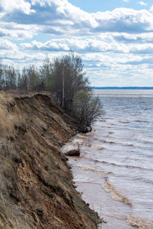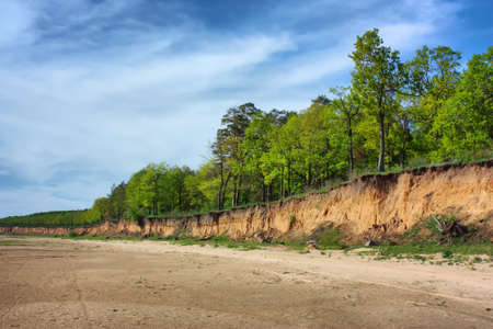Beautiful spring landscape on the precipitous sandy shore of the reservoir against the noise of the sea and azure sky