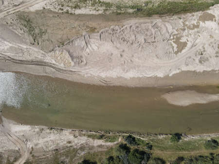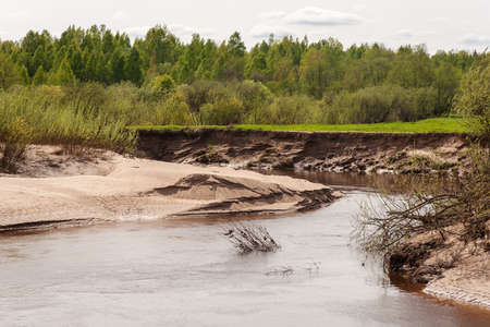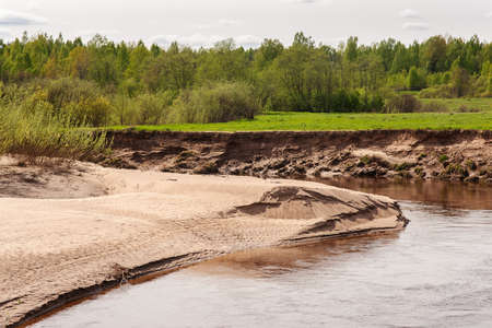 sandy coast of the twisting river in spring