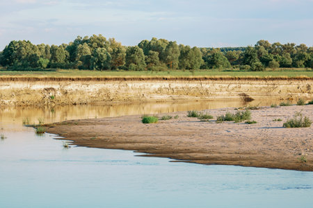 Scenic landscape. Sandy shore. Forest on background