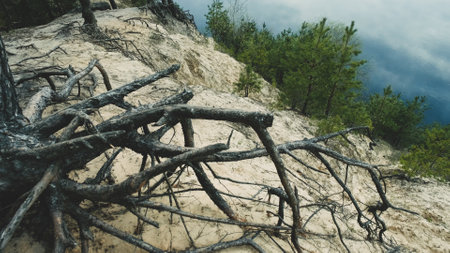 Big coniferous tree's roots on the sandy river's shore. Beautiful wild nature. Beautiful Wildlife.