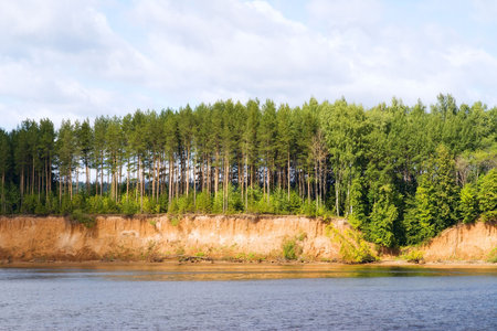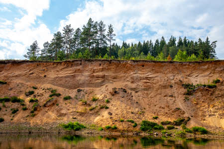 Landscape with cliff near the river Gauja, blue sky and trees. Gauja is the longest river in Latvia, which is located only in the territory of Latvia.