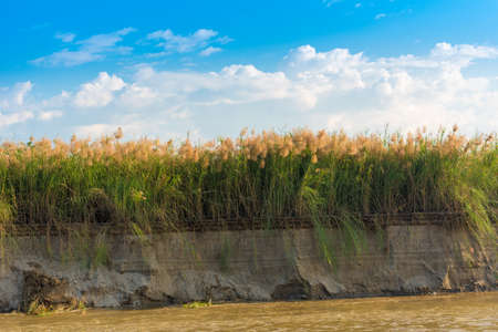 Bulrush on the Irrawaddy river, Mandalay, Myanmar, Burma. Copy space for text
