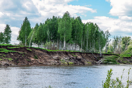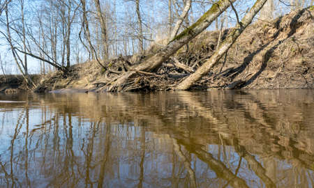 Steep bank of the river with leaning trees and snags near the water. Steep sandy Bank of a forest river with tree roots. Snags and fallen trees on the steep bank of the river.