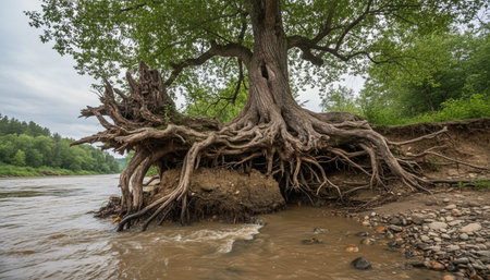 A trees roots exposed by flood damage on the river Eamont Penrith