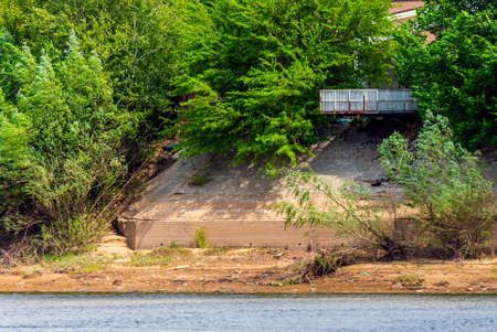 Old Pier and staircase on coast of dry river.