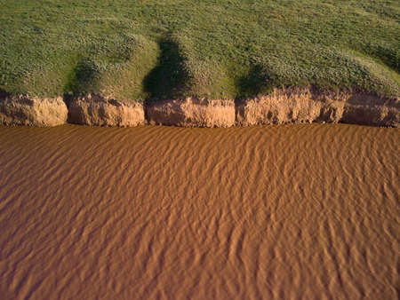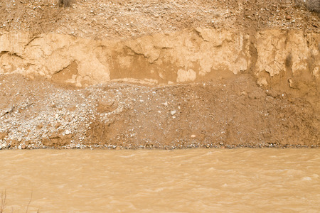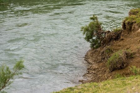 Riverbank erosion from floodwater close up shot beside the river